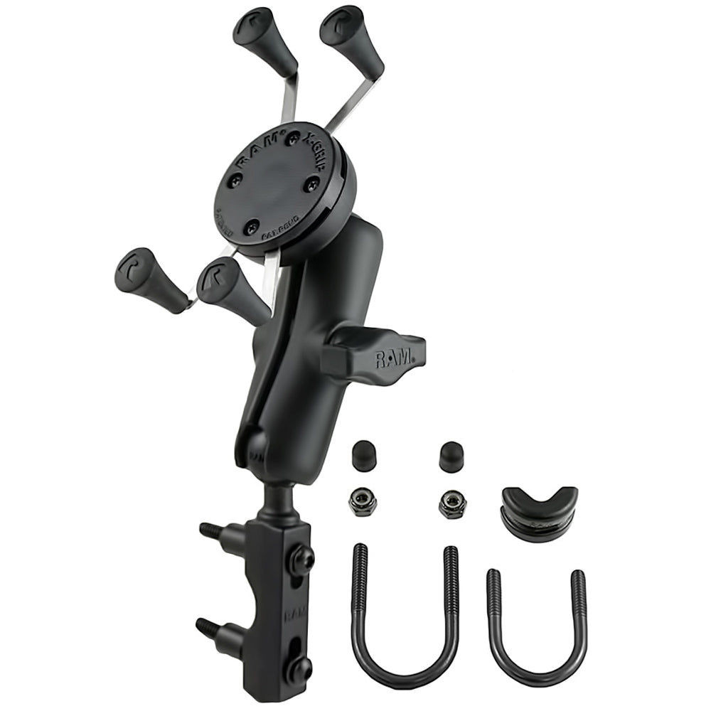 The RAM-B-174-UN7 consists of a double socket arm, hardware for mounting to both brake/clutch reservoirs and rails that are 0.5" to 1.25" in diameter and universal X-Grip cell phone holder. Designed into the mount is a 1" diameter patented rubber ball and socket system with adjustment points at both ends of the double socket arm. With a twist of the arm knob, you can move the cell phone holder to your optimum viewing position. The spring loaded X-Grip has a clean and clever four leg design that sports great holding power without hiding your phone behind foam pads and plastic.